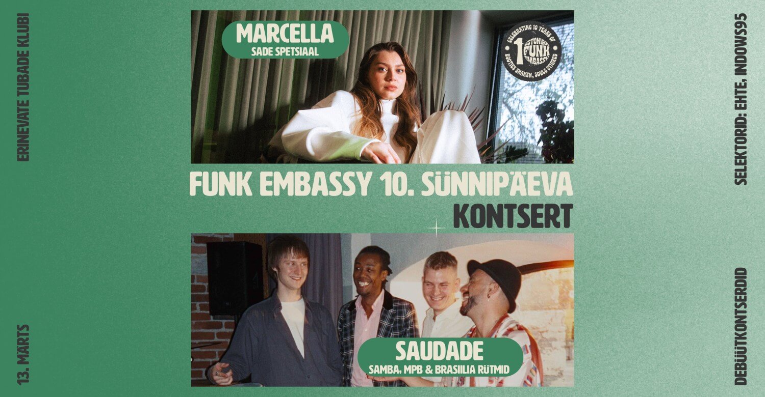 Funk Embassy 10. sünnipäeva pidustused jätkuvad kontsertõhtuga! Oma debüüdi teevad kaks värsket lisandust meie perre. MARCELLA koos andeka bändiga toob meieni Sade spetsiaali ning ka esimesed originaallood. Seejärel viib meid väga vajatud soojamaareisile SAUDADE, kellelt kuuleme nii omaloomingut kui ka tuntud palu samba, MPB ja afro-bloco vallast. Enne bände näitame lühifilmi FUNK EMBASSY X. Õhku bändide eel, vahel ja järel täidavad plaadimängijate taga INDOWS95 ja EHTE.