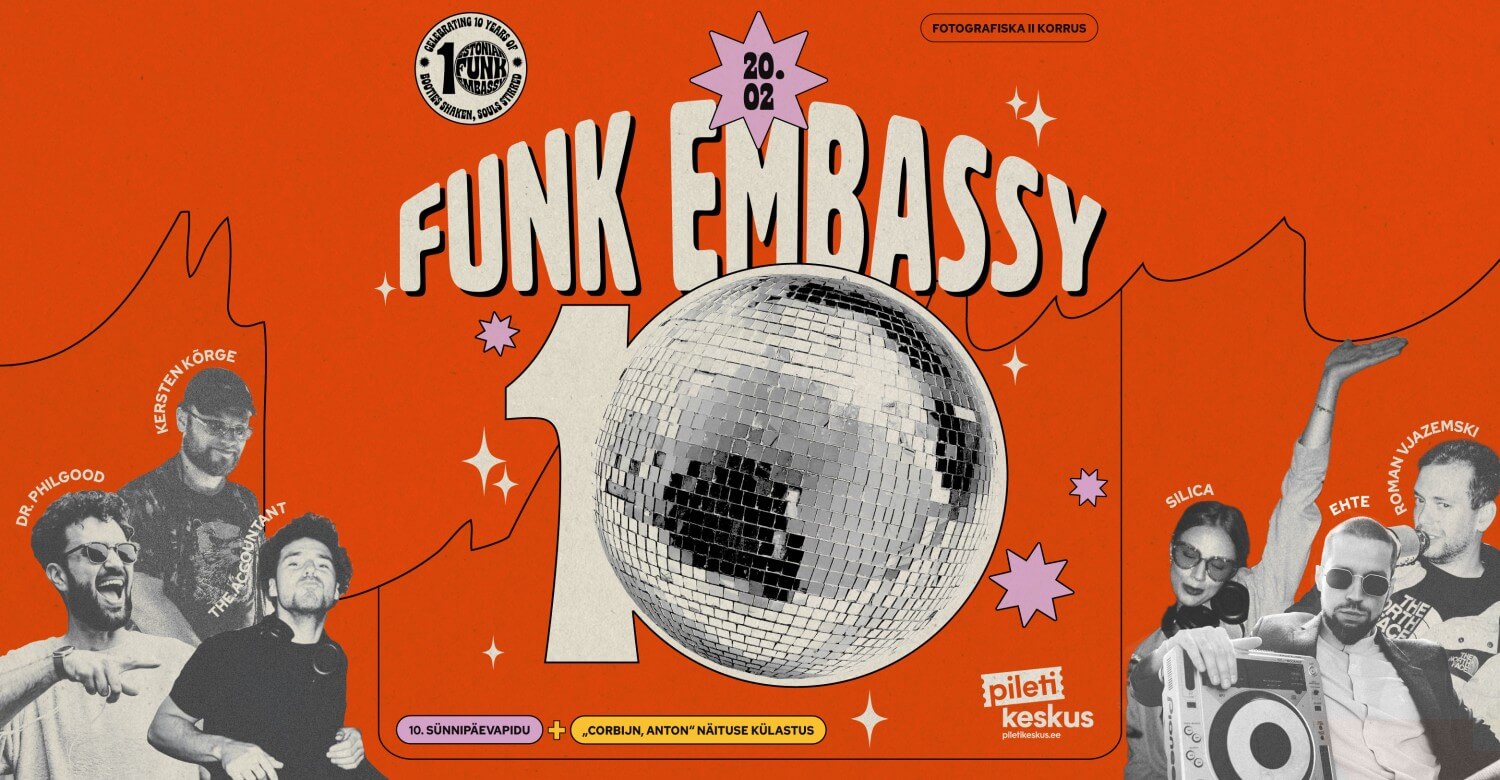 Funk Embassy kutsub! 10. sünnipäev on käes. Tähistame dekaadi funk-, soul- ja disco-asjaajamisi Fotografiskas, maailmakuulsa fotograafi Anton Corbijni teoste vahel, spetsiaalselt selleks puhuks loodud peosaalis. Tule, lööme diskopalli valguses kokku!
